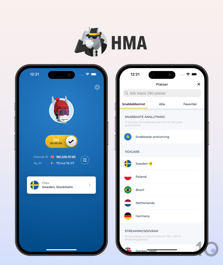 HideMyAss (HMA) är en säker och användarvänlig VPN med servrar i Sverige och 194 andra länder. Intuitiva appar, sju dagars kostnadsfri provperiod och höga hastigheter gör den till ett bra alternativ för de flesta användare. Den lyckas dock inte häva blockeringen av de flesta streamingplattformar, bl.a. Netflix, och saknar de avancerade funktioner, enhetskompatibilitet och kundsupport som topprankade VPN-tjänster erbjuder.