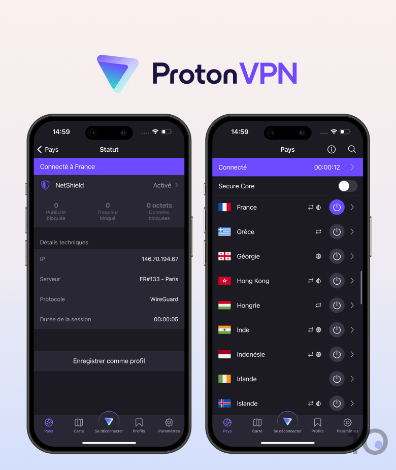 Les abonnés Proton VPN Plus et Proton VPN Unlimited ont accès à NetShield, le bloqueur de publicités, de logiciels malveillants et de traqueurs. Vous pouvez l’activer en cliquant sur l’icône du bouclier depuis l’écran d’accueil de l’application.