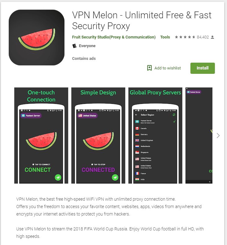 Fruit Security Studio relaunched VPN Melon under the new name of “Free Vpn Proxy” on October 11 2018. The Google cached version of the original Melon VPN Play Store listing shows that they are are the same app based on the screenshots of the distinctive UI.
