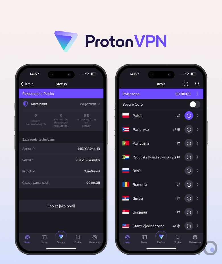 • Serwery Secure Core z multi-hop zapewniają silne szyfrowanie i łatwe w obsłudze aplikacje