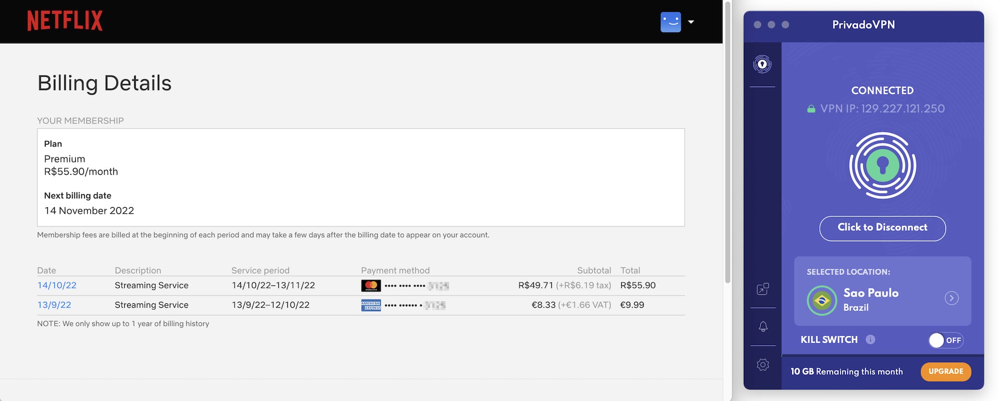 Możesz zobaczyć nasz bieżący okres rozliczeniowy w realach brazylijskich oraz poprzedni, który opłaciliśmy w euro – Netflix nie ma problemu ze zmianą regionów oraz walut.