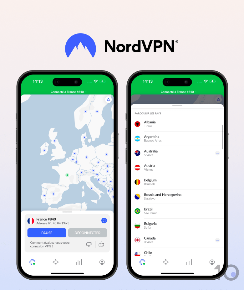Vous pouvez utiliser NordVPN sur un maximum de 10 appareils à la fois. C’est légèrement mieux que la norme de l’industrie, mais toujours moins que des concurrents comme Surfshark qui offrent des connexions illimitées.